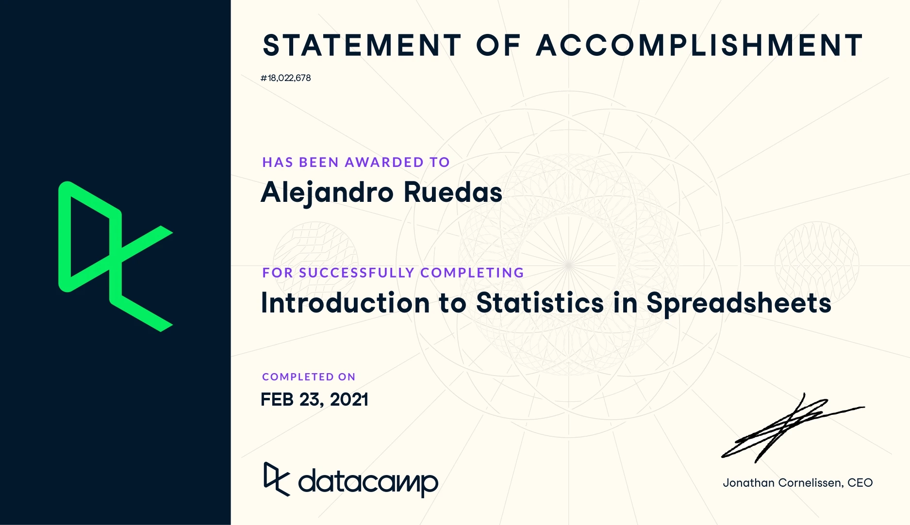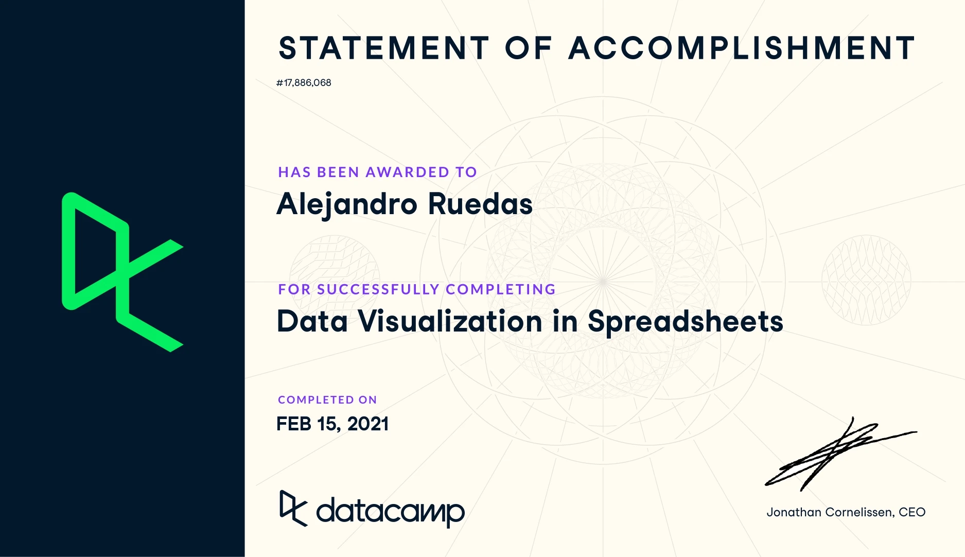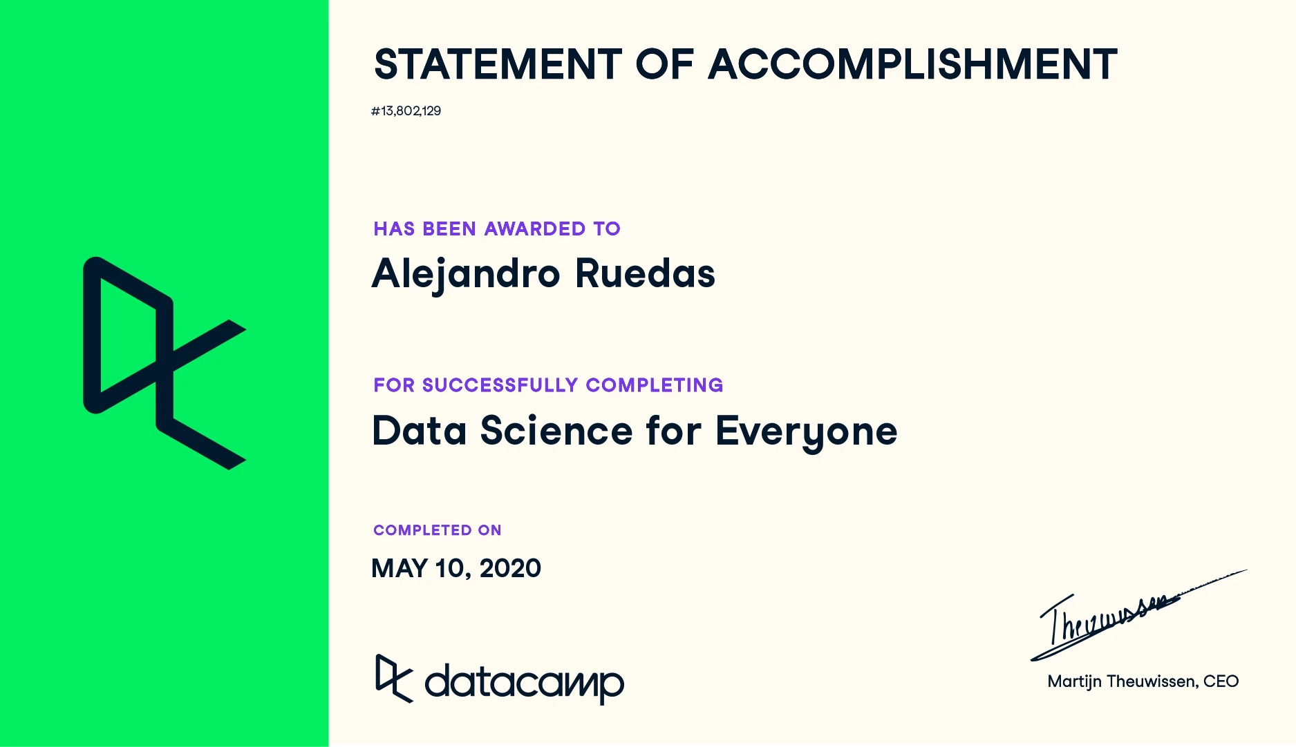 As a naturally curious person, I enjoy learning new things and developing new skills. Thanks to the advent of the Internet, we can keep learning anytime from anywhere. Although I have tried to narrow my focus on learning more about data science, programming and, most recently, web development, you can find links to all my certified training down below.